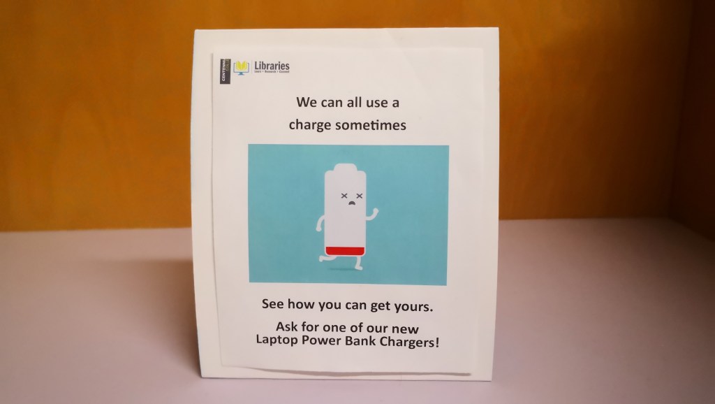 Today when I sit on the sharing table on the second floor of Centennial College, I find a small placard on the table. It gives clear instructions about how to get a laptop power charger on campus. I was so surprised when I saw this. As a student who lives far from campus, sometimes I really need to charge my laptop, but I just forget to bring my charger. Also, sometimes I just do not want to bring my charger simply because it is too heavy. If I can just borrow one on campus, there will be much convenient for me. I think that many students may have the same idea like me. The setting of sharing chargers can really help. For example, one who forgot to charge his laptop last night needs to show his PowerPoint today on his presentation, if he can find a charger from the front desk of the library, his concern could be dispelled. The sharing chargers are accessible for everyone who studies or works on this campus. Of course, it is necessary for students to keep the sharing chargers safe and clean, and return the chargers after school.
