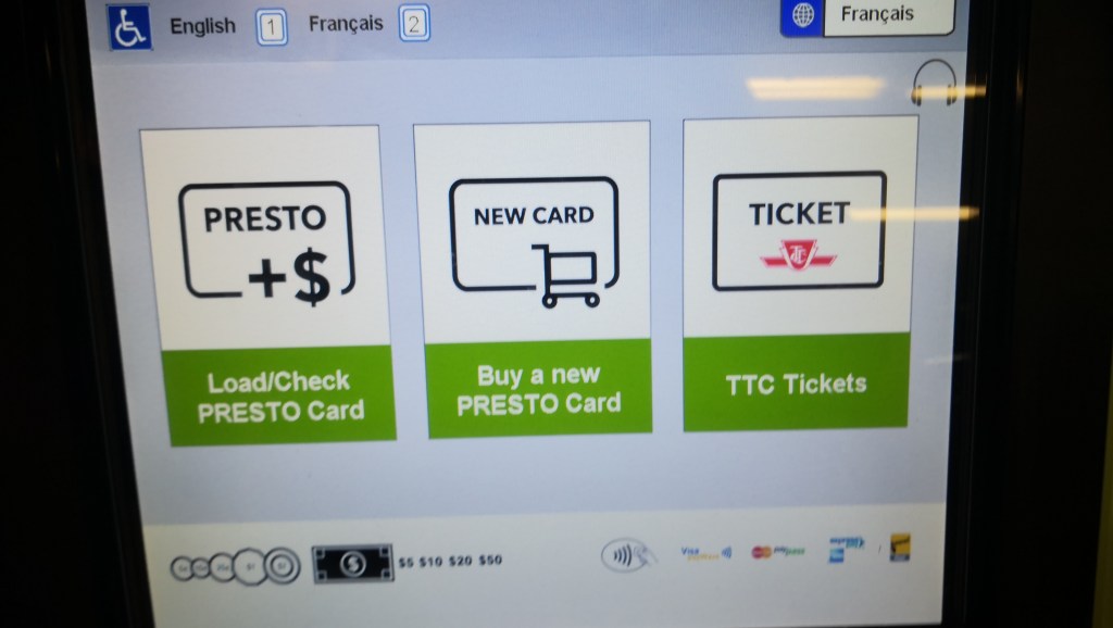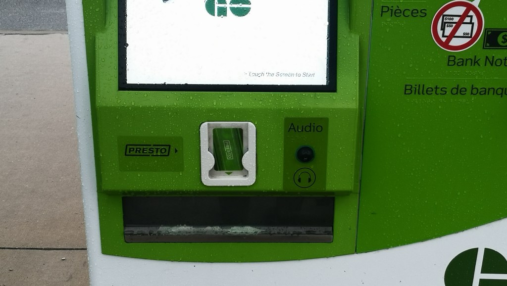 Presto card is one of the necessities of life for people living in Toronto. Recharge machines are everywhere in this city, so it is very convenient for people to recharge their cards. However, not everybody can see the screen or read the words. Today when I load my Presto card, I suddenly find out that there is an audio jack below the screen. I was so curious about it so I insert my earphone and see what would happen. At the moment I insert my earphone, the screen suddenly turns into another mode. From the earphone, I can hear the instructions about how to use this machine. Following the instructions, people can press the number on the pin pad to choose the language and the service they need. The instruction will also tell people where the pin pad is.