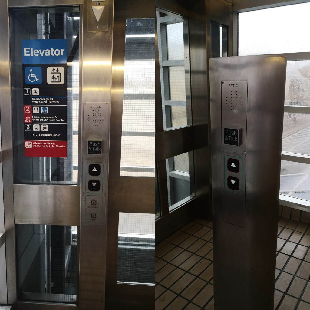 Today, when I go through the Scarborough Town Centre, I find a new elevator (or not new elevator) in the bus station. It has two push-button board. One is in a normal place like other elevators, another one is on the left side of the waiting area. This design could make it easier for wheelchair users, and not influence other people to use. If watching closer, one could notice a large press key “Push & Talk”. As a result, if there is any situation that happens or anyone needs help, he or she can push the key and talk. On the left side of the elevator, a poster gives a clear introduction of each floor and instruction for wheelchair users. So, people can know which floor they are going to go to, and the possibility of an accident might be reduced.