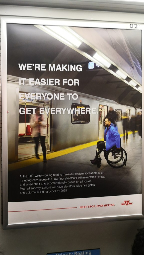 There is a poster on the TTC Line 2 Subway car. I saw it today when I was coming home. The poster shows a slogan and a paragraph of the brief introduction of TTC’s accessible design. The slogan says, “We’re making it easier for everyone to get everywhere”. The paragraph mentions their new accessible, low-floor streetcars with retractable ramps and wheelchair-friendly buses. And they plan to have elevators, wide fare gates and automatic sliding doors in all subway stations by 2025. First of all, I think the accessible design on all TTC bus is very good. Second, their plan for the future is also very friendly and efficient. But I think there is something more that could be improved. For example, the gap between the train and platform is quite big. It is very convenient and dangerous for wheelchair users to cross the gap and get on the train. Also, even though there are many priority seats, there is not space or retractable chairs for wheelchair users to posit and make their wheelchair fast. If TTC does so in the future, the subway might be more friendly and accessible for everyone.
