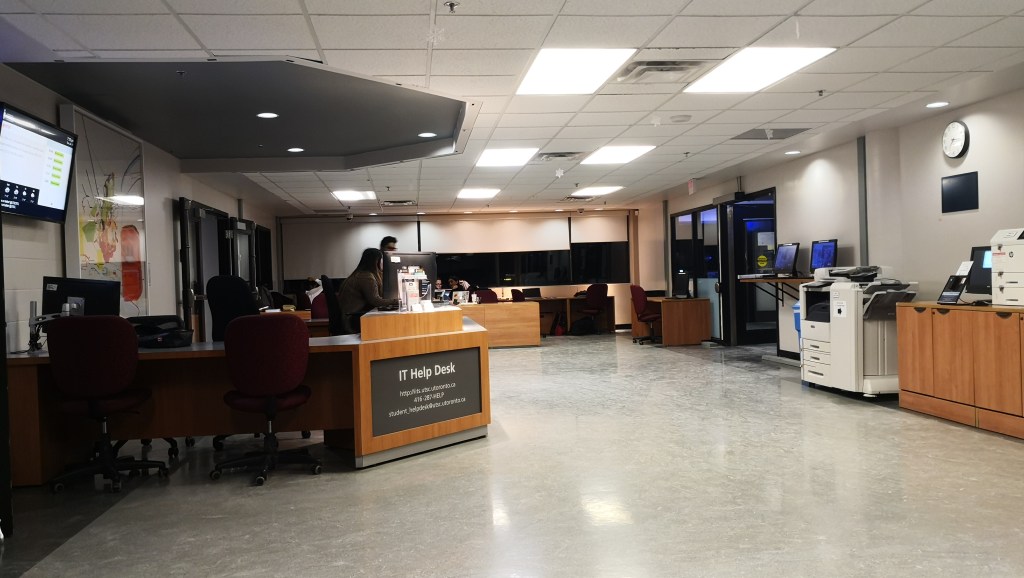 On the fourth floor of the BV building of UTSC, there is an IT Help Desk. Usually, there will be one or two staff there for helping to solve some technical problems. But sometimes the waiting line is too long, and sometimes there is no staff. What can students do when facing such situations? The solution is the information showing on the front desk. There are clear indications about where to get more information, how to connect staff and the e-mail address. Therefore, it can save a lot of time for both staff and students, making solving problems more efficiently.
