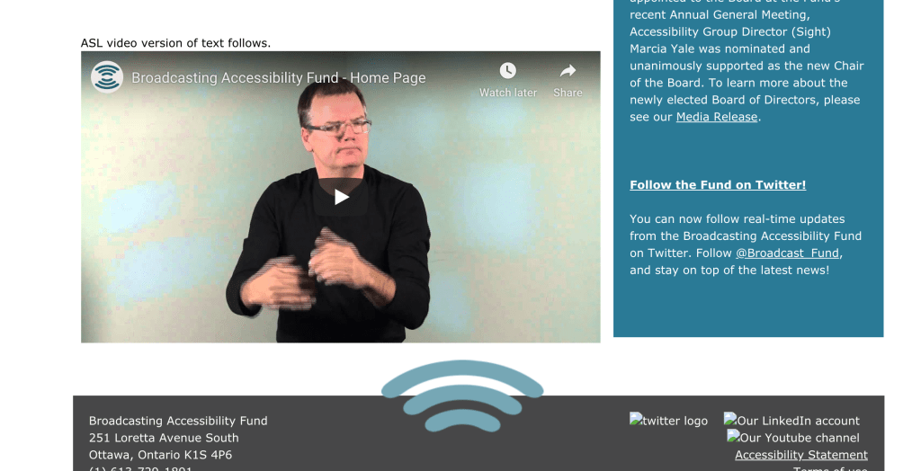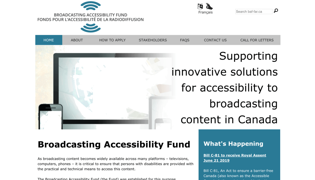 I find a webpage called ‘Broadcasting Accessibility Fund’. It was established to ensure that persons with disabilities are provided with practical and technical means to access broadcasting content, such as mobile phones, television, and computer. This fund will provide grants for creative accessibility designs in Canada. I think the existence of the fund is a great encouragement for young generation designer, promoting the development of accessibility design and popularizing such awareness. Also, on its webpage, audiences can switch language from English to French, vice versa. Meanwhile, at the bottom of each page, there will be a video showing ASL video version of the text on this page, helping people with disabilities to read and providing a good example of accessibility design.