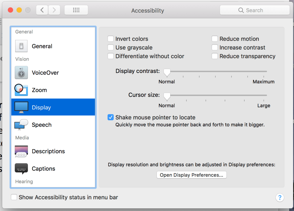 In the system preference of Mac, there is a setting called ‘Accessibility’. It divided into five main parts: General, vision, media, hearing, and interacting. Taking vision as an example, VoiceOver can describe the items on computer screens and provide controls through the use of the keyboard. Zoom can make the screen larger or smaller. The display can make a screen showing different colours, lightness, and contracts.